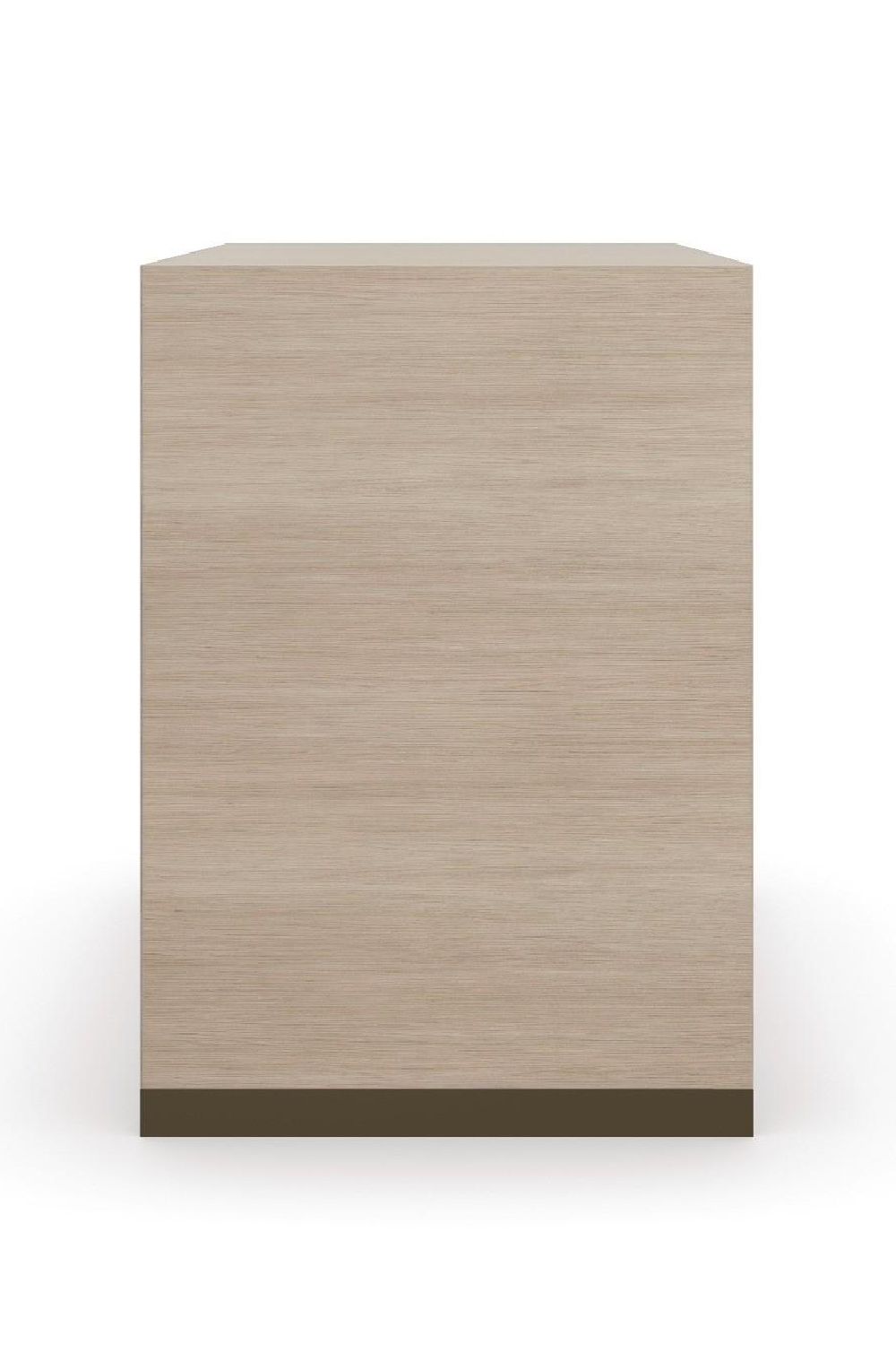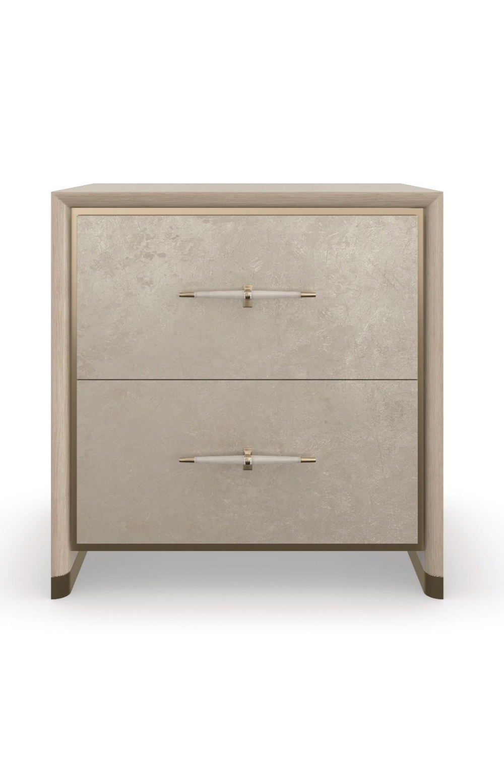 Encantadora mesita de noche, Hang Up combina la belleza natural de la madera con el atractivo del metal. Cajones con cierre suave revestidos de hoja metálica escarchada evocan ventanas cubiertas de escarcha iluminadas por velas. Detalles en oro cepillado y tiradores en cuero sintético cosido a mano añaden calidez y lujo. Úsala en pareja o con su versión mayor para mayor impacto visual.